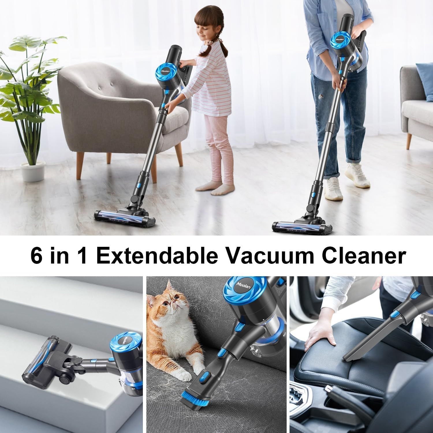 - [2 Suction Mode Adjustable] The cordless vacuum cleaners for home provides 22KPa powerful suction on MAX mode, is perfect for cleaning dirt, pet hair, Carpet, furniture or hardwood floor. You can easily adjust the suction power according to your cleaning requirements.